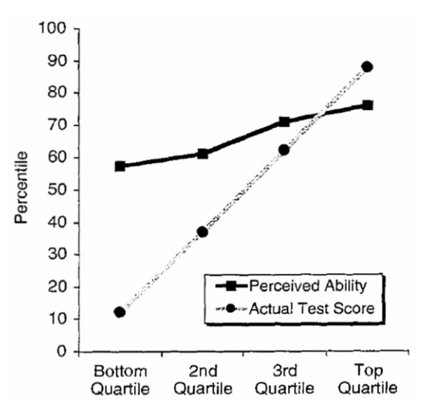 اثر دانینگ – کروگر: «افرادی که در یک مهارت ضعیف هستند ، معمولاً ارزیابی خوبی از وضعیت خود ندارند و به عبارت دیگر، متوجه نیستند که در آن مهارت ضعیف هستند .